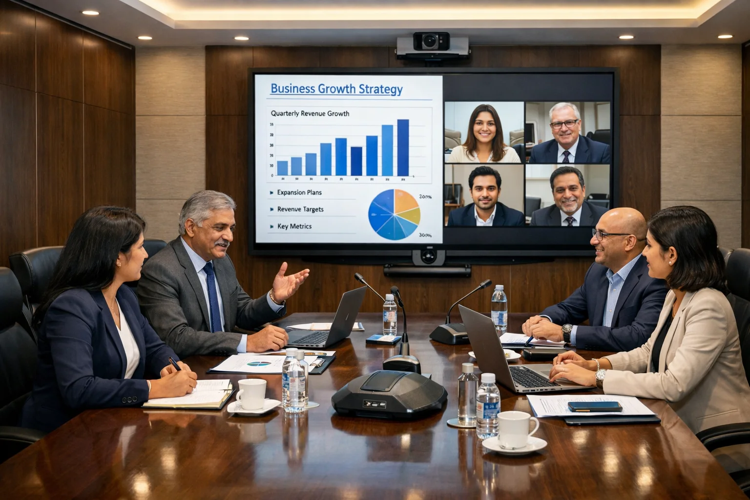 Executive meeting environments designed for leadership discussions, strategic presentations, and high‑level collaboration.